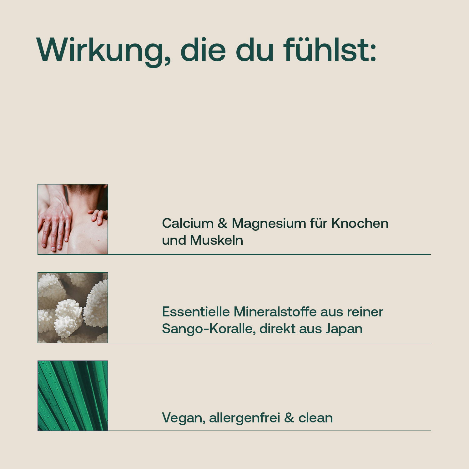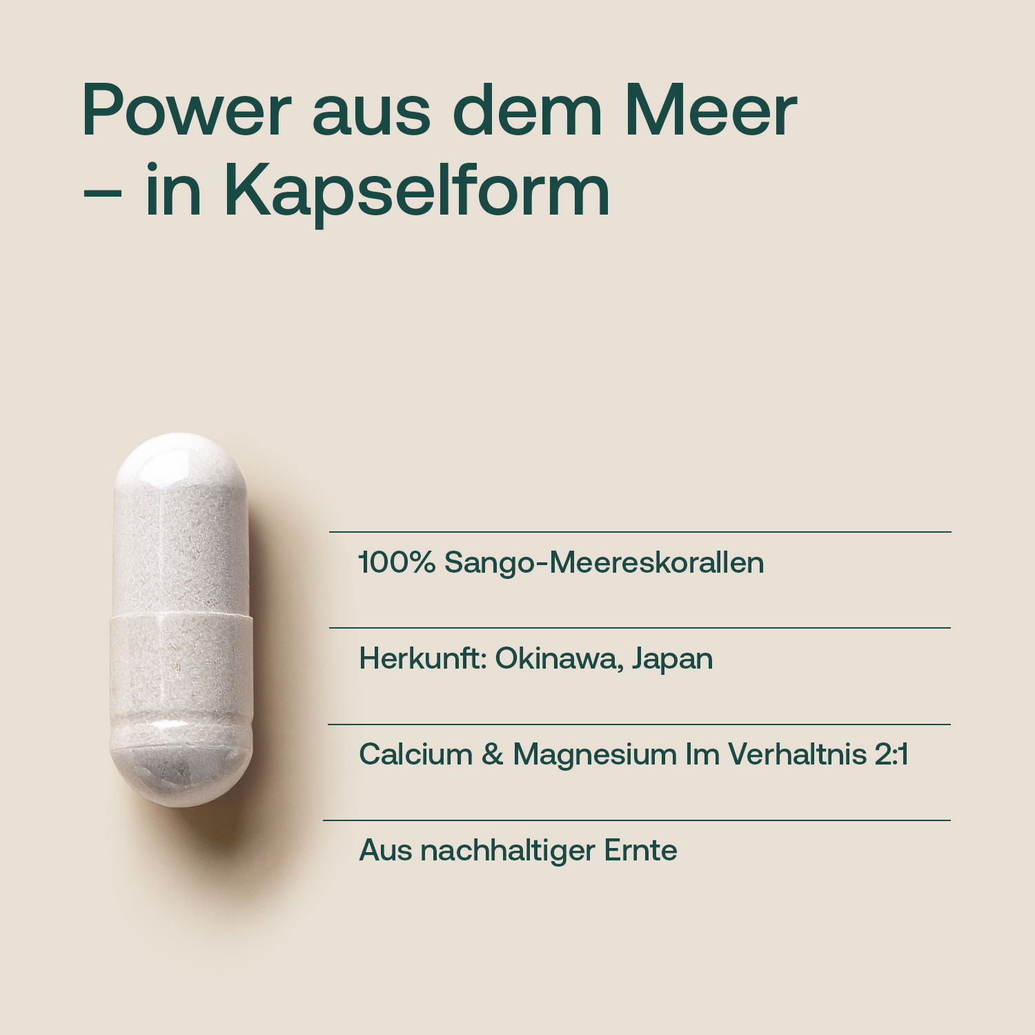 Die Kapseln liefern eine optimale Versorgung an Calcium und Magnesium im idealen Verhältnis und können so einen wichtigen Beitrag zur täglichen Versorgung mit diesen und weiteren wichtigen Mineralstoffen und Spurenelementen leisten. Eine Tagesdosis Sango-Kapseln kann mehr als zwei Drittel des Tagesbedarfs an den beiden Mineralstoffen decken.